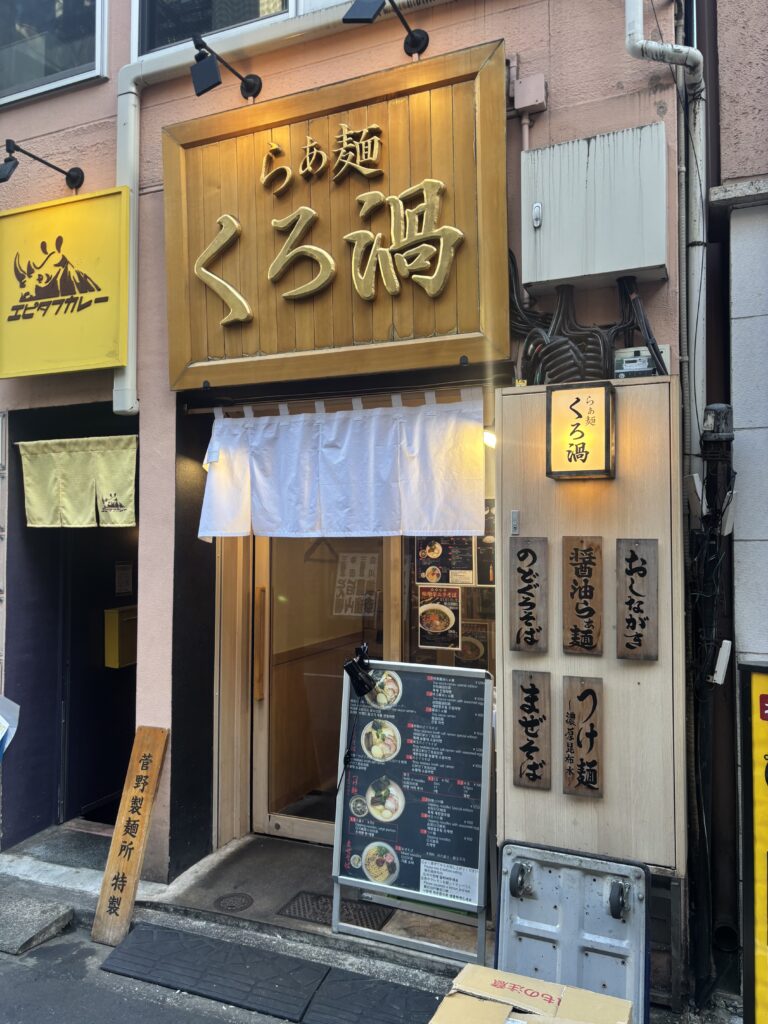 今回は行ってきたラーメン店である「らぁ麺 くろ渦」は、新宿三丁目駅から2分ほどあるいたところにある新宿三丁目に店を構える人気ラーメン店で、鶏清湯を中心とした『上品系ラーメン』で知られています。席数はカウンター9席とテーブル席、合計で15席前後の比較的小さなお店ですが落ち着いた雰囲気の店構えで、一人でも入りやすく、男女問わず幅広い層が来店するのが特徴でした。