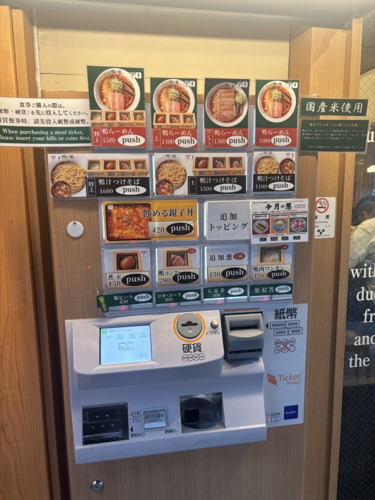 メニューは、看板メニューの「鴨ラーメン」を中心に値段が増すにつれトッピングが増えていきます。今回は、鴨肉をしっかり食べたので「コンフィ鴨ラーメン(1360円)+飲める親子丼(420円)」を購入しました。