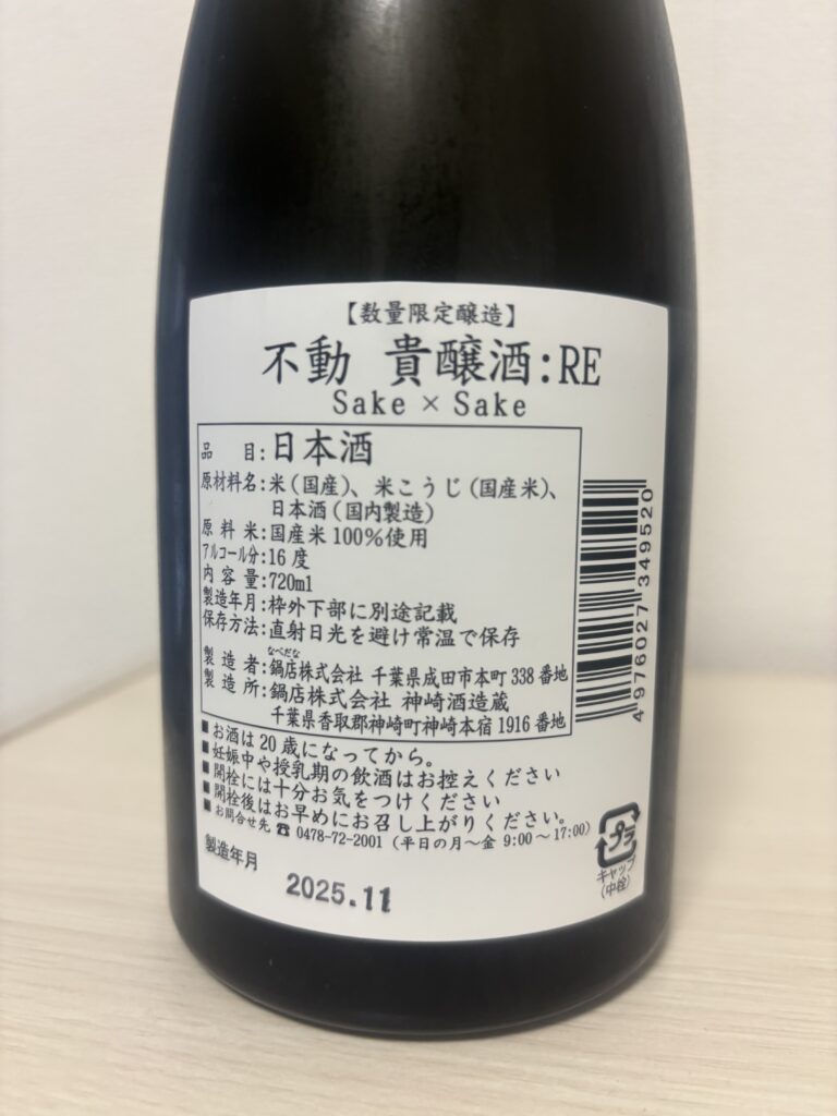 今回紹介紹介する日本酒は、鍋店酒造 が手掛ける貴醸酒であるこちらの「不動 貴醸酒 :RE」です。名前にある 「:RE」reborn(再生)restart(再出発) を意味しており、一度完成した日本酒を熟成させ、その酒を仕込み水の代わりに使って再び仕込むという独自の発想が込められています。