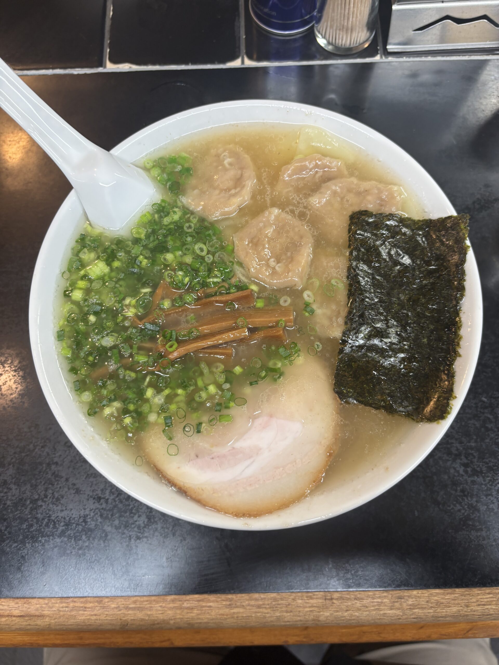 「チャーシュ、メンマ、ネギ、海苔、ワンタン(5個)」です