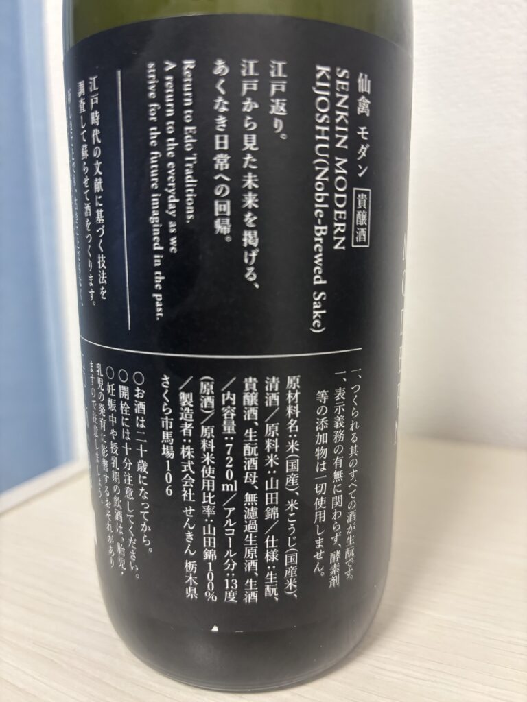 「モダン」という名が示す通り、この一本は「貴醸酒=甘くて濃厚なお酒」、という固定観念を裏切ってくれました。伝統的な製法を踏まえつつも、軽快さと透明感を大切にした仕上がりで、貴醸酒の新しい楽しみ方を提示してくれる一本だと感じました。