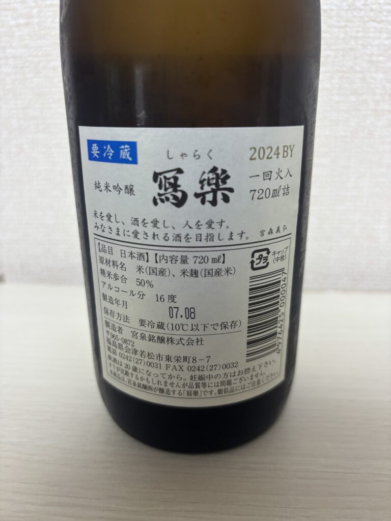 今回紹介する日本酒である、「冩樂(しゃらく) 純米酒 火入」は、福島県会津若松市の宮泉銘醸が手がける人気銘柄のひとつです。地元産の酒米「夢の香」を60%まで精米して仕込み、火入れ(加熱処理)を一度行うことで、フレッシュさを保ちながらも安定した味わいに仕上げられています。