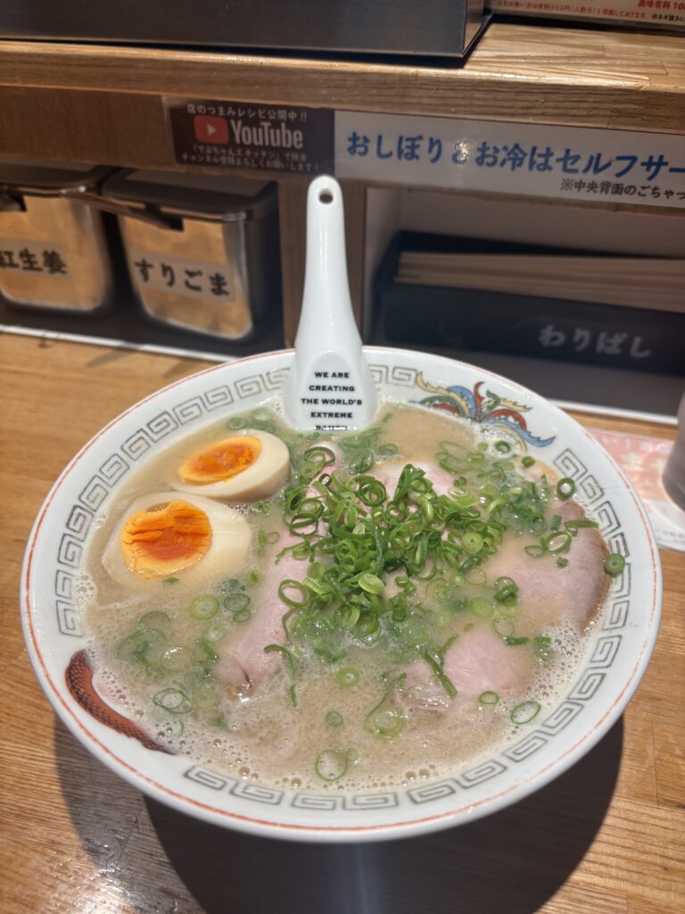 豚骨スープはコクがありながらも重すぎず、旨味がしっかりしているので、ついテンポよく食べ進めてしまいます。後味も良く、サクッと完食できるのは博多ラーメンらしい魅力だと改めて感じました。やはり本場スタイルの豚骨ラーメンは安定して美味しいですね。