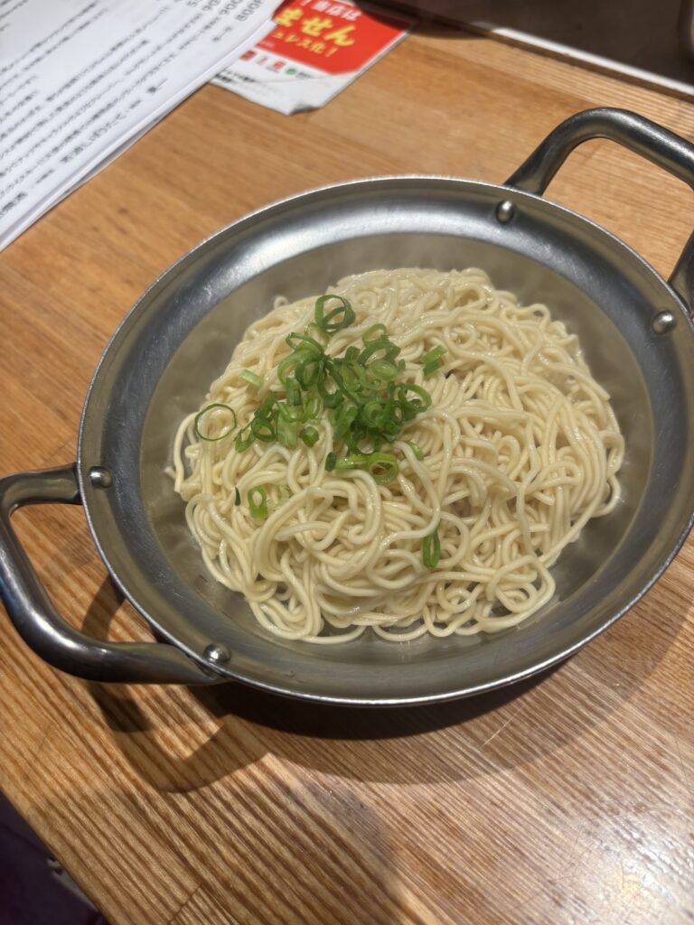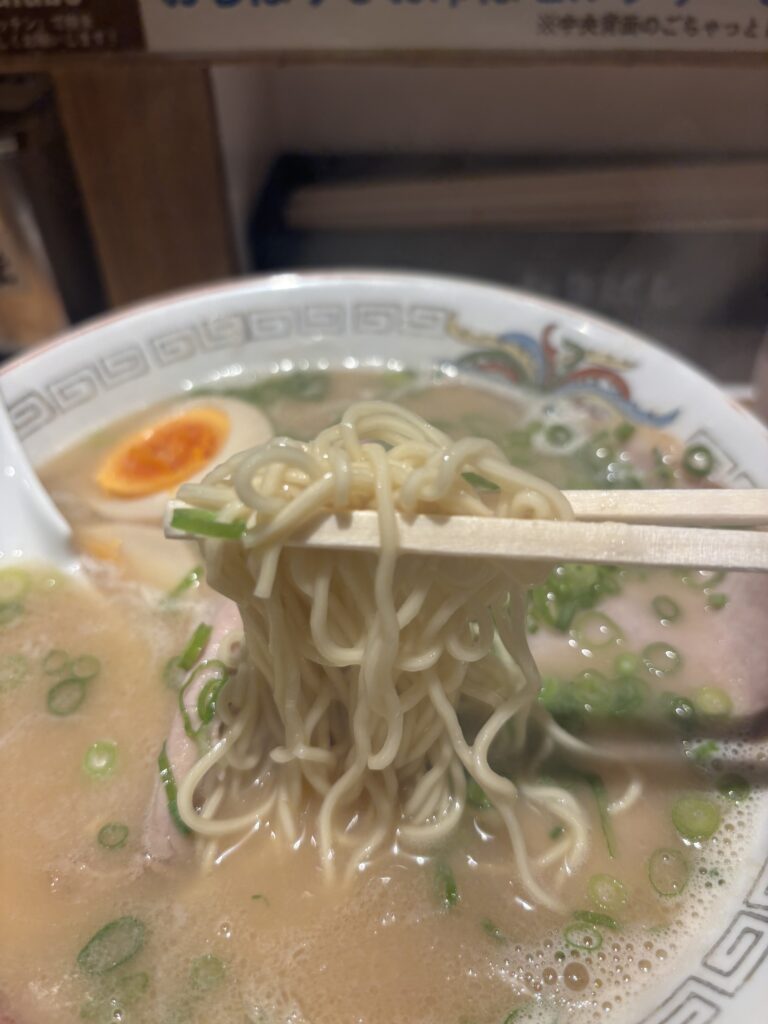 茹で時間が短く仕上がる博多豚骨らしいのどごしの良さと軽快さが特徴で、替え玉(別料金)との組み合わせも人気です。最初の一杯目は麺の固さは選択できませんが替え玉の時は固さをへんこうできるようでした。