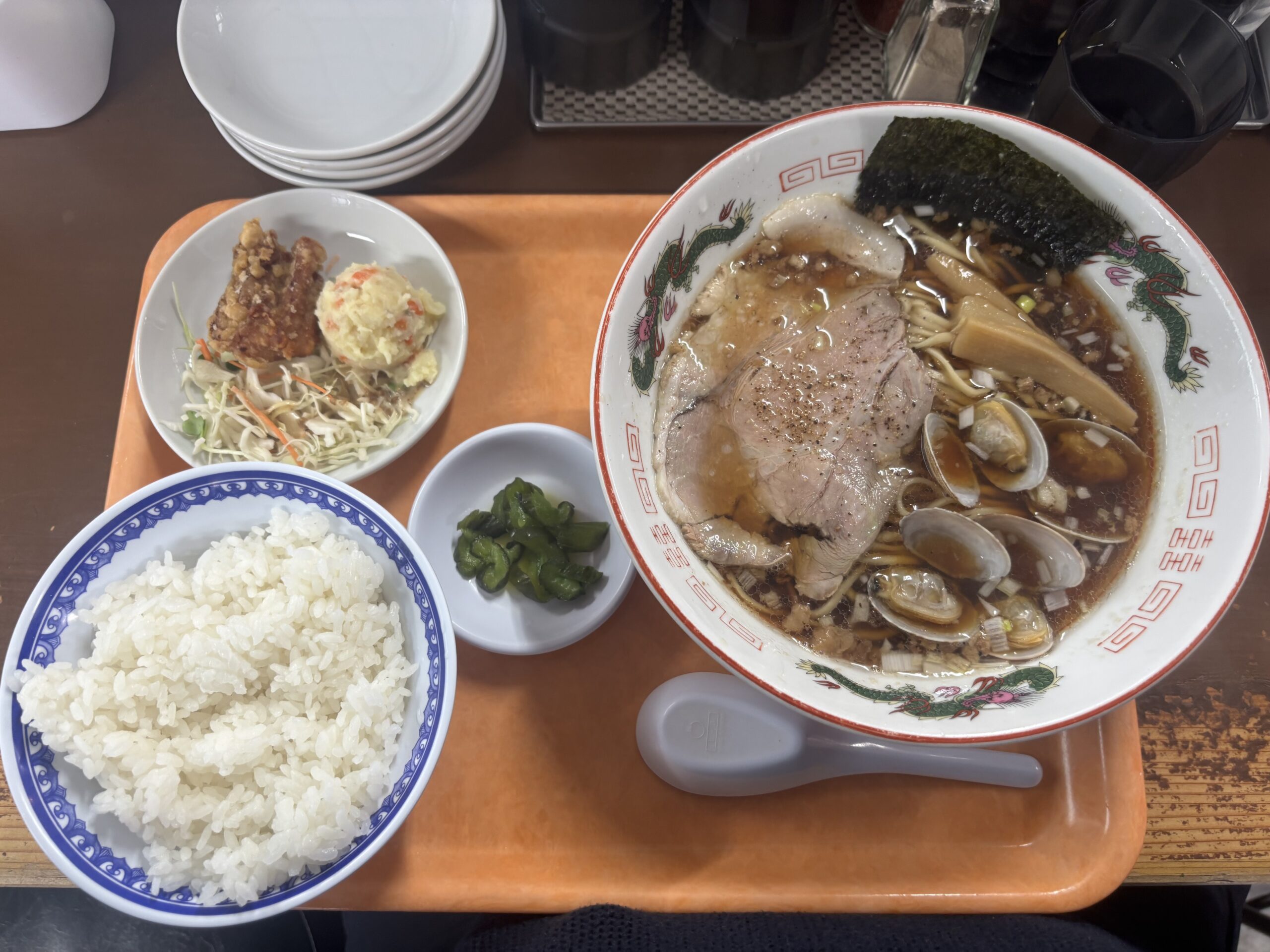定食としては、中華そばにご飯と小鉢が付く構成で、バランスの取れた一食になっています。ラーメンの塩気とご飯の組み合わせは相性抜群で、つい箸が止まらなくなりました。ボリュームも十分で、男性でもしっかり満足できる内容です。