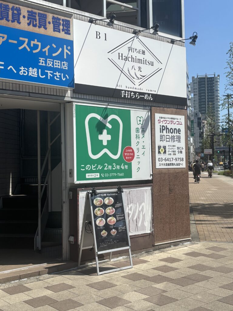 今回行ってきたラーメン店である、「手打ち正麺 Hachimitsu(八光)」は、東京都品川区西五反田にあるラーメン店です。大崎広小路駅から徒歩3分ほど、五反田駅からも徒歩4〜5分とアクセス良好なところにあります。地下1階に店を構えており、店内はカウンター席とテーブル席を備えたこぢんまりとした造りですが、とても清潔感があるお店という印象でした。
