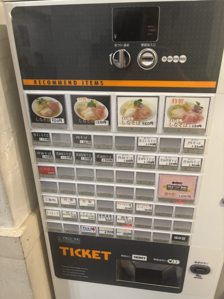 主なメニューは「しなそば(醤油・白だし)」を中心に、「背脂そば(同じ醤油・白だし)」といったバリエーションがあります。今回は、「特製白だししなそば(1250円)」にしました。