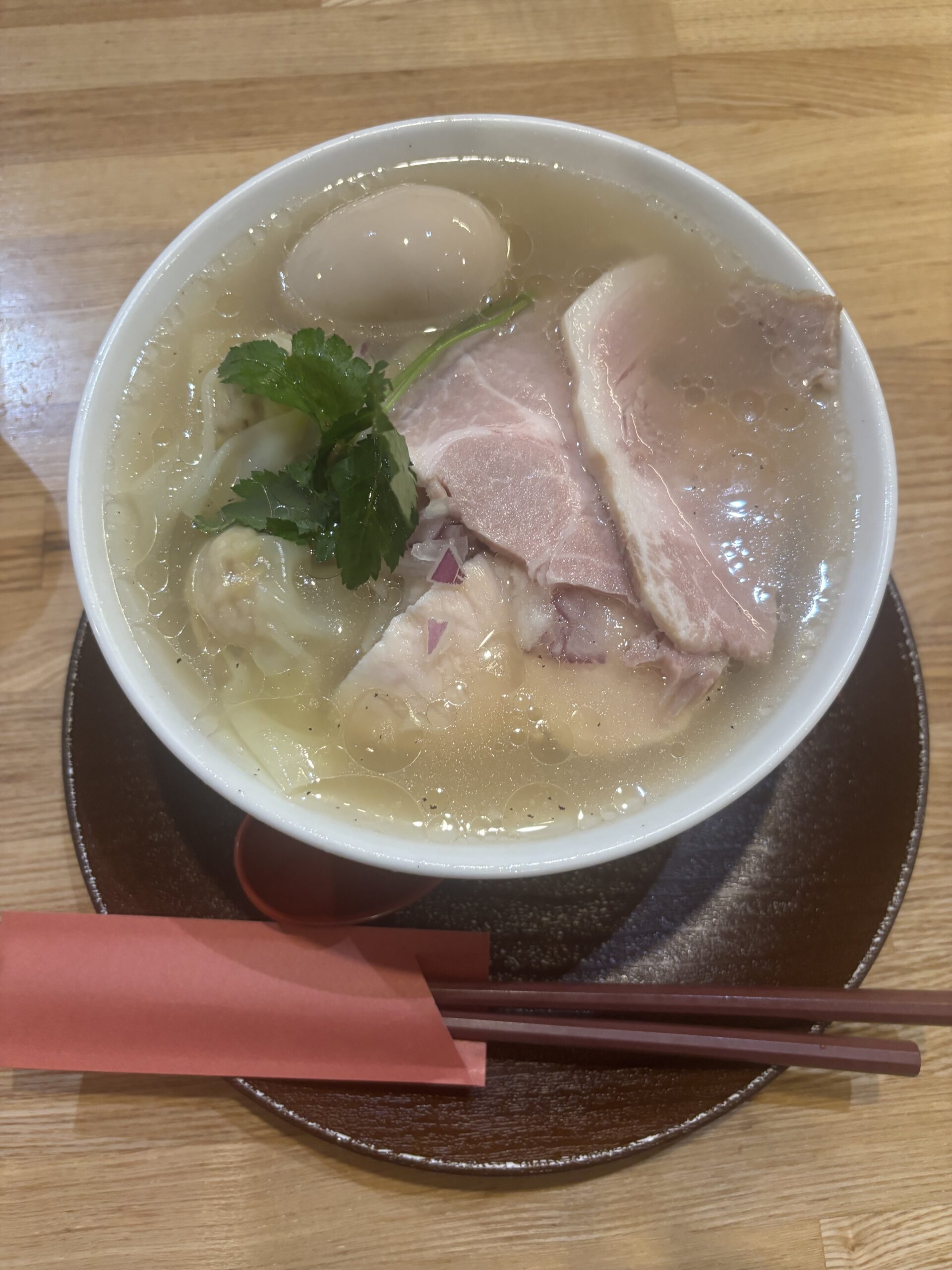 トッピングの特徴として、「チャーシュー(低温調理の豚チャーシュー、鶏チャーシュー)ワンタン、紫玉ねぎ、味玉、三つ葉」となっておりました。