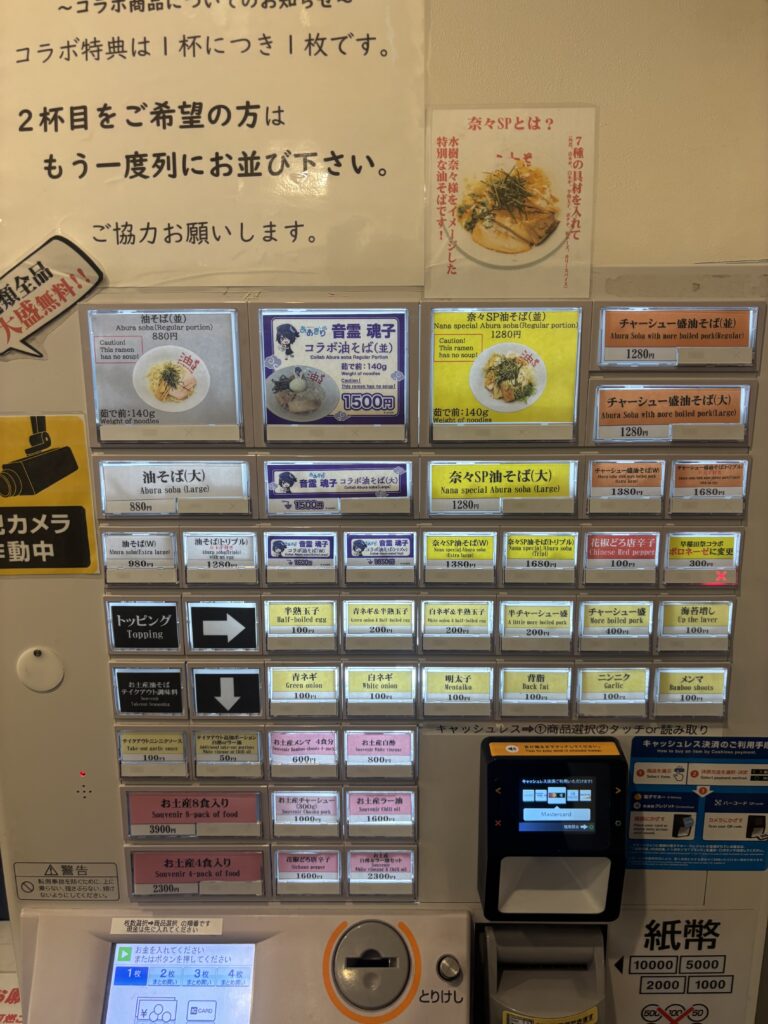 今回は、声優の水樹奈々さんをイメージした油そばがあるということを聞いてきたので、こちらの「奈々SP油そば[大](1280円)」を購入しました。