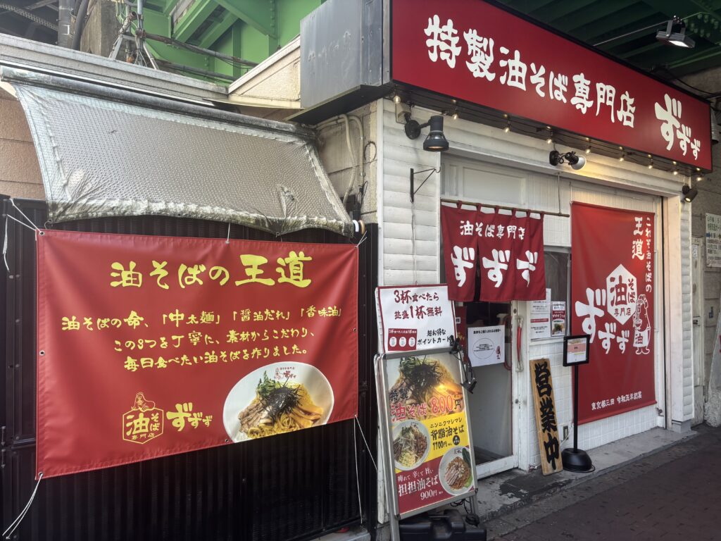 今回行ってきたラーメン店である「油そば専門店 ずずず」は、JR五反田駅から徒歩1分ほどの高架下にある、油そば(まぜそば)を専門とするお店です。昼から深夜まで通しで営業しているため、ランチタイムはもちろん、仕事帰りや夜遅い時間にも立ち寄れる利便性の高さが魅力です。