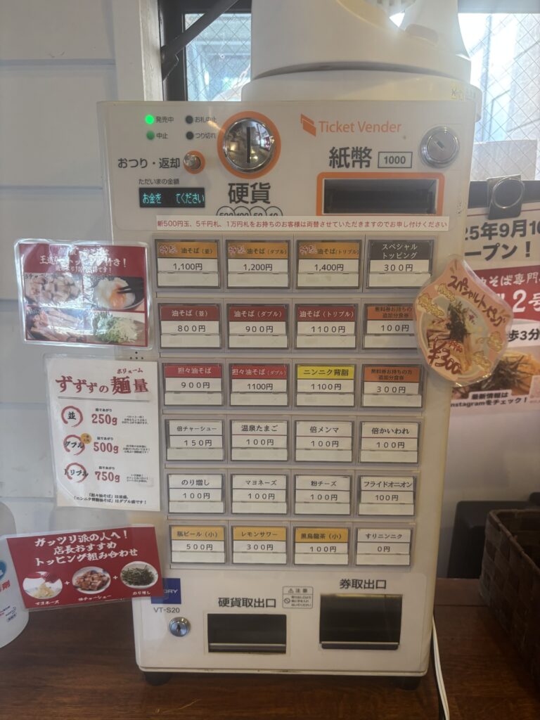 基本メニューは「油そば」。担々油そばやニンニク背脂油そばなど、パンチのあるメニューも用意されており、トッピングや味変アイテムで好みに応じて調整できます。