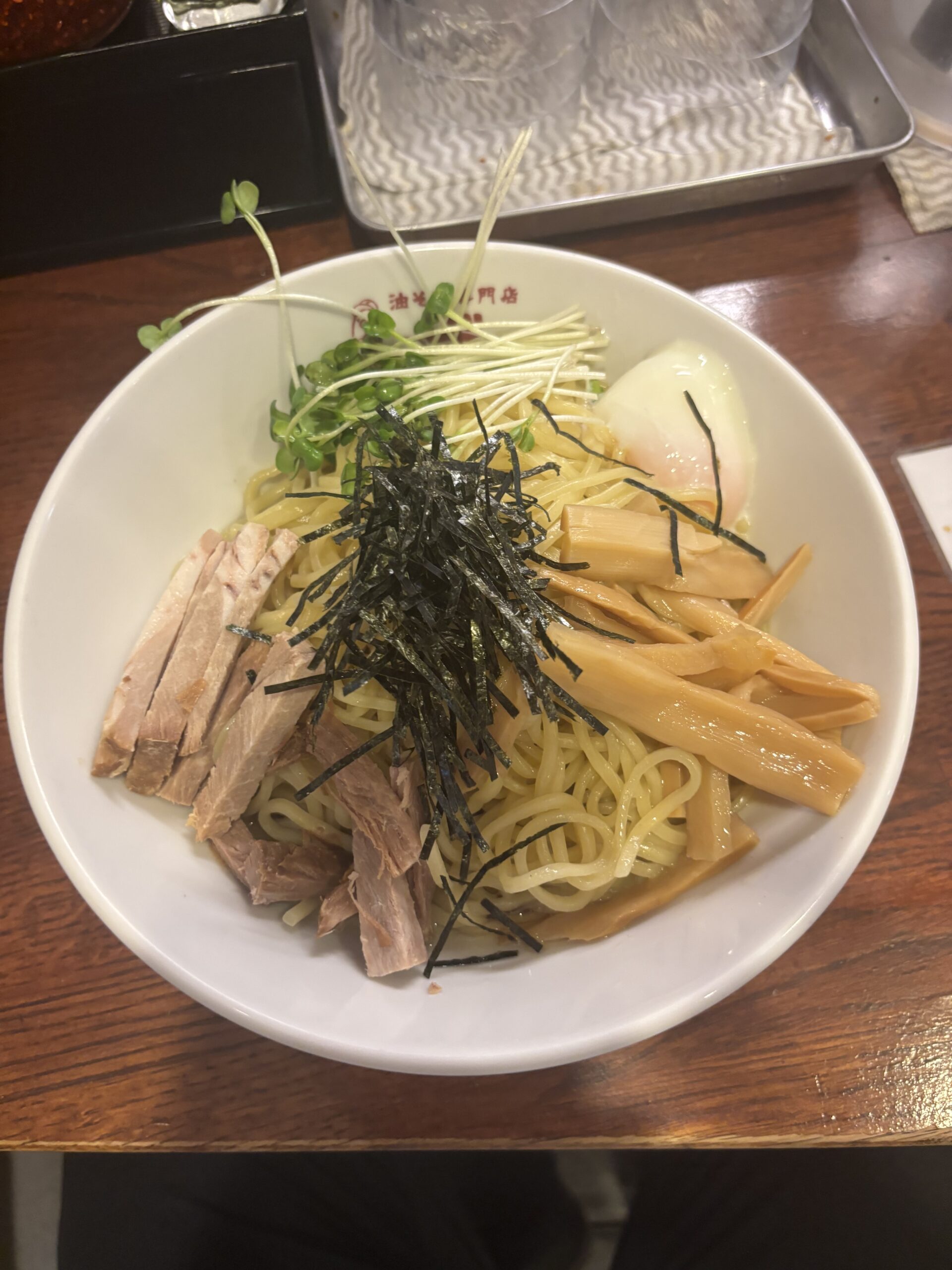 基本メニューは「油そば」。担々油そばやニンニク背脂油そばなど、パンチのあるメニューも用意されており、トッピングや味変アイテムで好みに応じて調整できます。