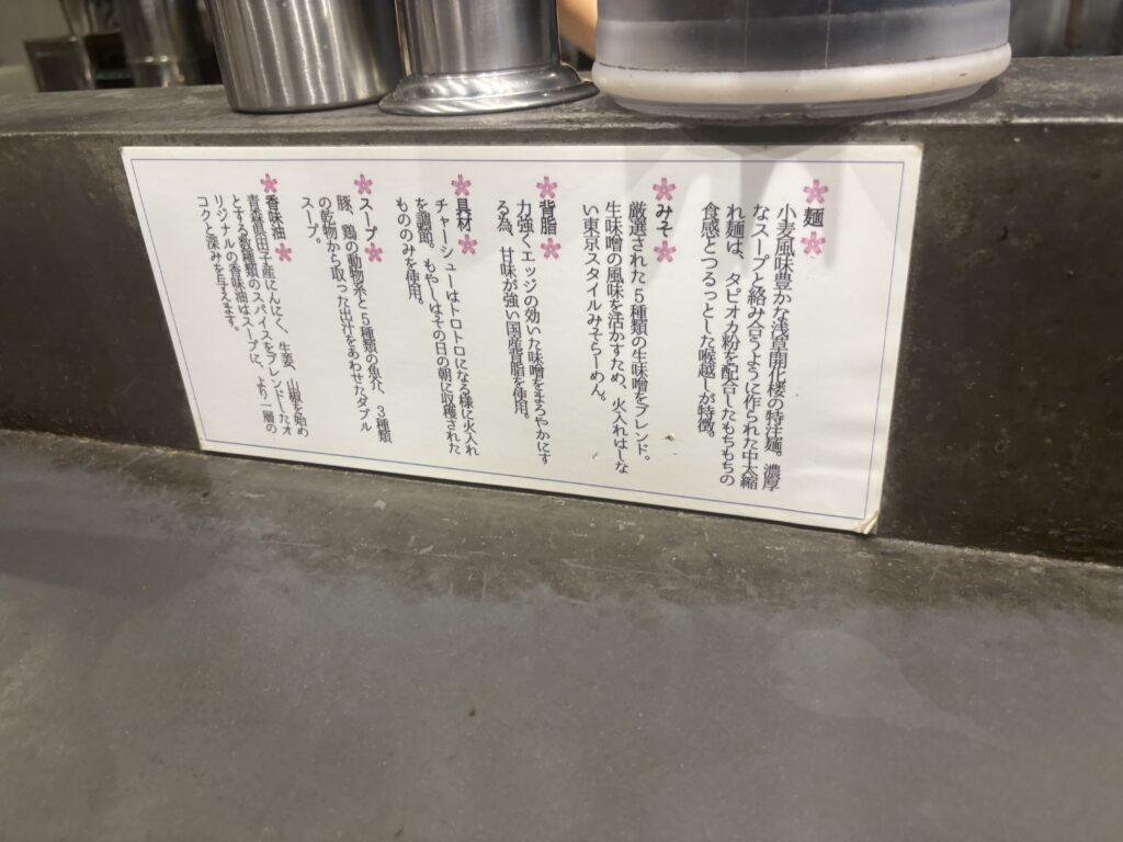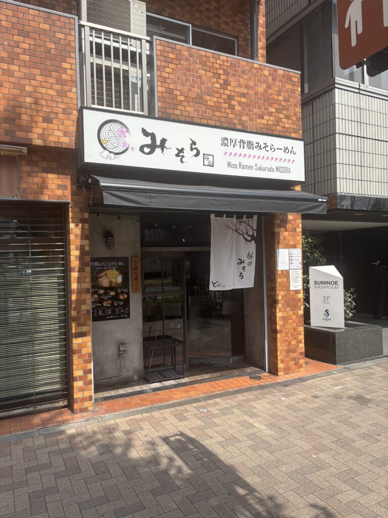 今回行ってきた「濃厚背脂みそらーめん 桜田 みそら」は五反田駅から5分ほど歩いたところにある味噌ラーメン専門店です。店主は、「ど・みそ」出身で、味噌ラーメンに特化したこってり系を追求しているお店です。店舗は L字型のカウンター席が10席ほどで、こぢんまりとしていながらも清潔感があり、ラーメンを集中して楽しめる雰囲気があります。