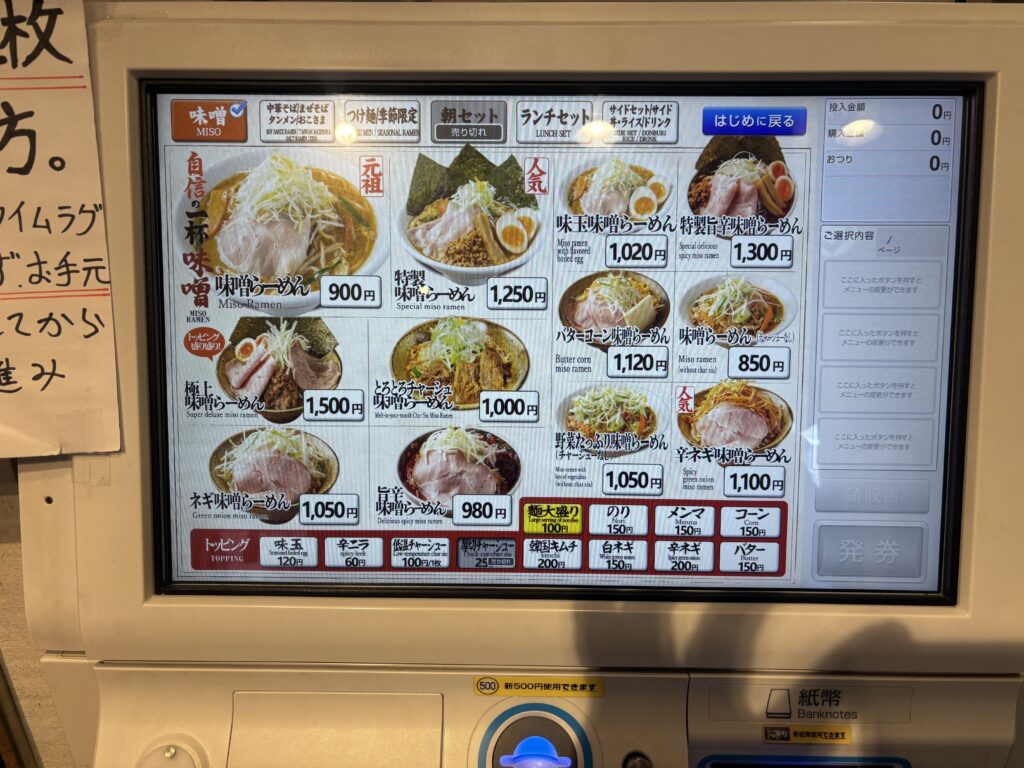 メニューは味噌ラーメンを中心に、辛味派や野菜多め、特製バージョンなどバリエーション豊富となっておりました。今回は王道であり元祖の「味噌ラーメン(900円)」を購入しました。